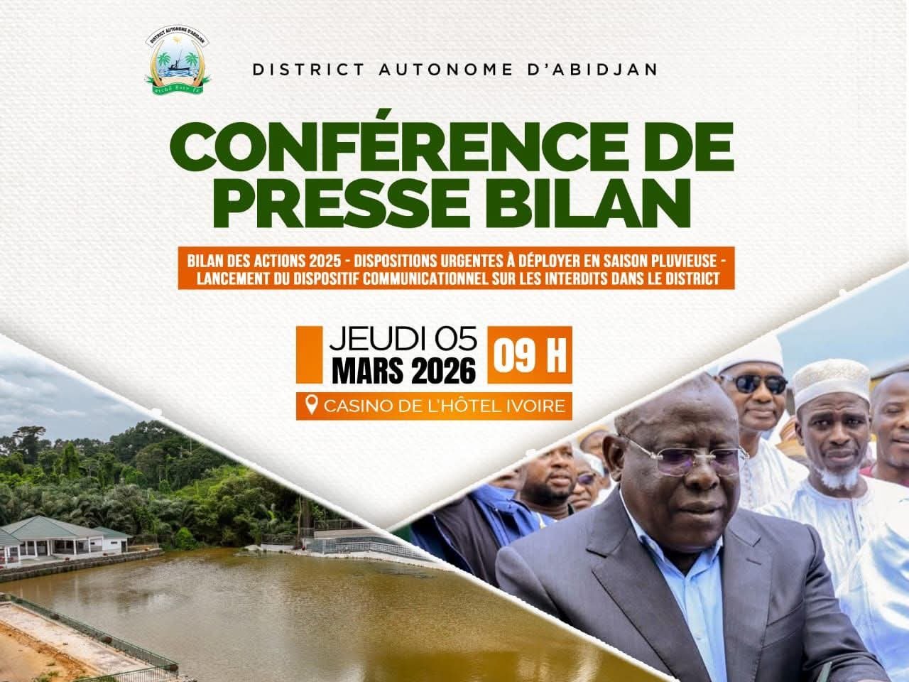 Le jeudi 5 mars 2026, à partir de 9 heures, le Casino de l’Hôtel Ivoire à Cocody accueillera une conférence de presse d’envergure animée par Cissé Ibrahima Bacongo, Ministre Gouverneur du District Autonome d’Abidjan.