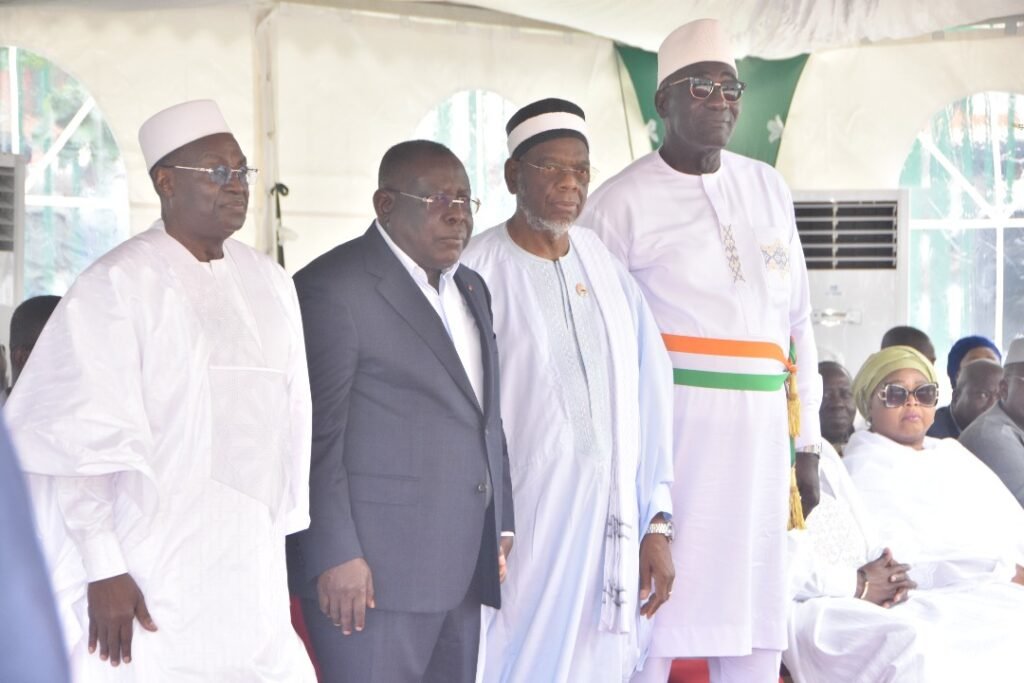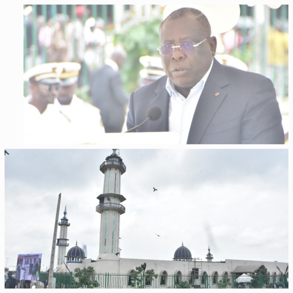 La Grande Mosquée Salam d’Adjamé, joyau architectural et symbole spirituel d’Abidjan, a officiellement rouvert ses portes ce vendredi 17 octobre 2025, après d’importants travaux de réhabilitation. La cérémonie d’inauguration, présidée par le Vice-Président de la République, Tiémoko Meyliet Koné, a été marquée par de vives marques de reconnaissance à l’endroit du Ministre-Gouverneur du District Autonome d’Abidjan, Cissé Ibrahima Bacongo.