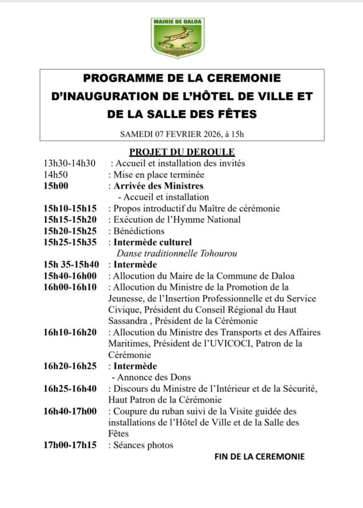 La commune de Daloa procédera demain, à l’inauguration officielle de son nouvel Hôtel de Ville et de la salle des fêtes.